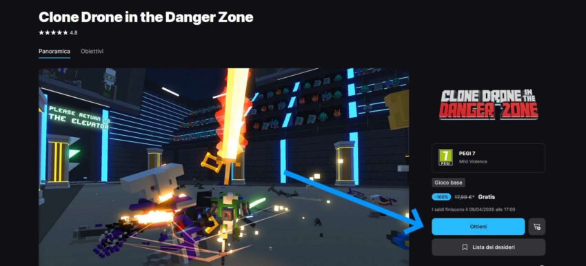 Per ricevere Clone Drone in the Danger Zone basta collegarsi al sito: store.epicgames.com/it/p/clone-drone-in-the-danger-zone-4daf6e.