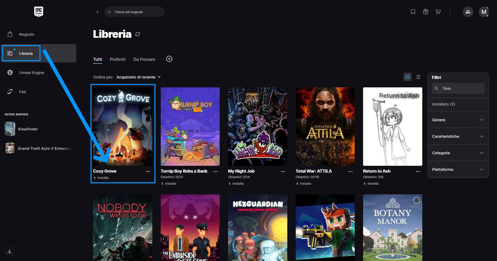 Troverete Cozy Grove nella vostra libreria di Epic, per installarlo sarà sufficiente cliccare sulla sua immagine: