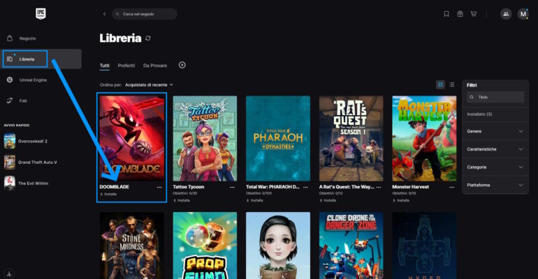 Troverete DOOMBLADE nella vostra libreria di Epic, per installarlo sarà sufficiente cliccare sulla sua immagine: