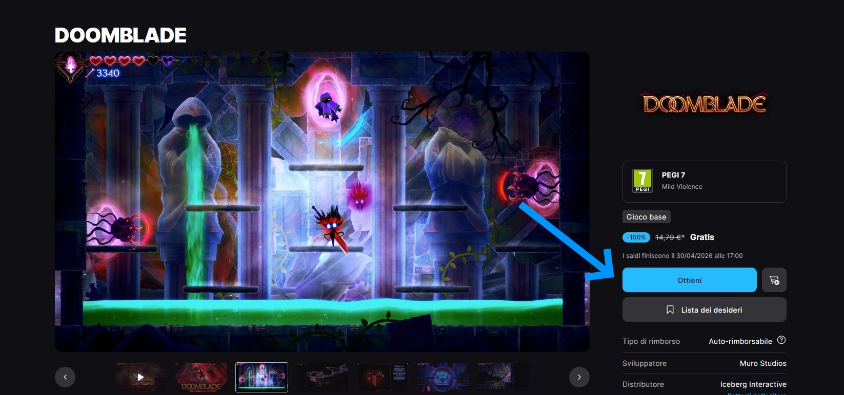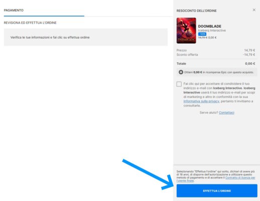 Per ricevere DOOMBLADE basta collegarsi alla pagina web: store.epicgames.com/it/p/doomblade-afdf9a.
