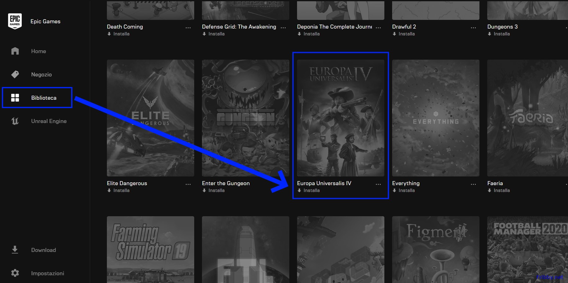 Troverete Europa Universalis IV nella vostra Biblioteca di Epic, per installarlo sarà sufficiente cliccare su “Installa”: