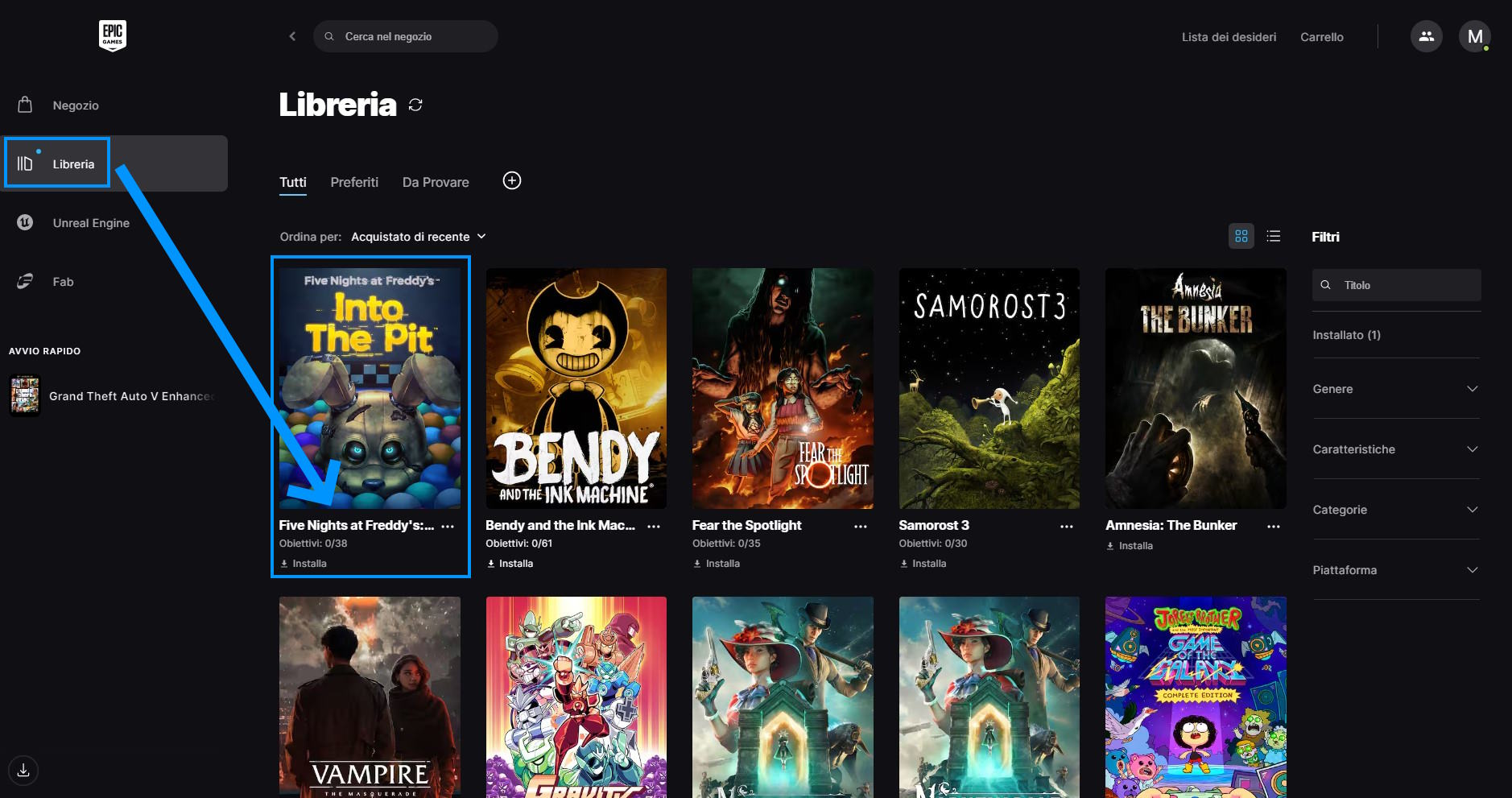 Troverete FIve Nights at Freddy’s: Into the Pit nella vostra libreria di Epic, per installarlo sarà sufficiente cliccare sulla sua immagine: