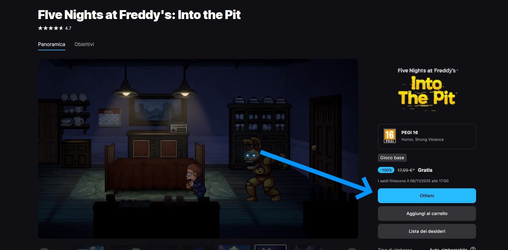 Per ricevere Five Nights at Freddy’s: Into the Pit basta collegarsi all’ indirizzo: store.epicgames.com/it/p/five-nights-at-freddys-into-the-pit-99c563.
