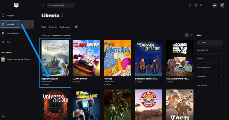 Troverete Hogwarts Legacy nella vostra libreria di Epic, per installarlo sarà sufficiente cliccare sulla sua immagine: