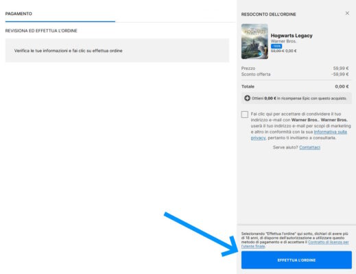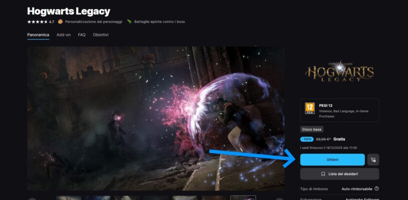 Per ricevere Hogwarts Legacy basta collegarsi alla pagina: store.epicgames.com/it/p/hogwarts-legacy.