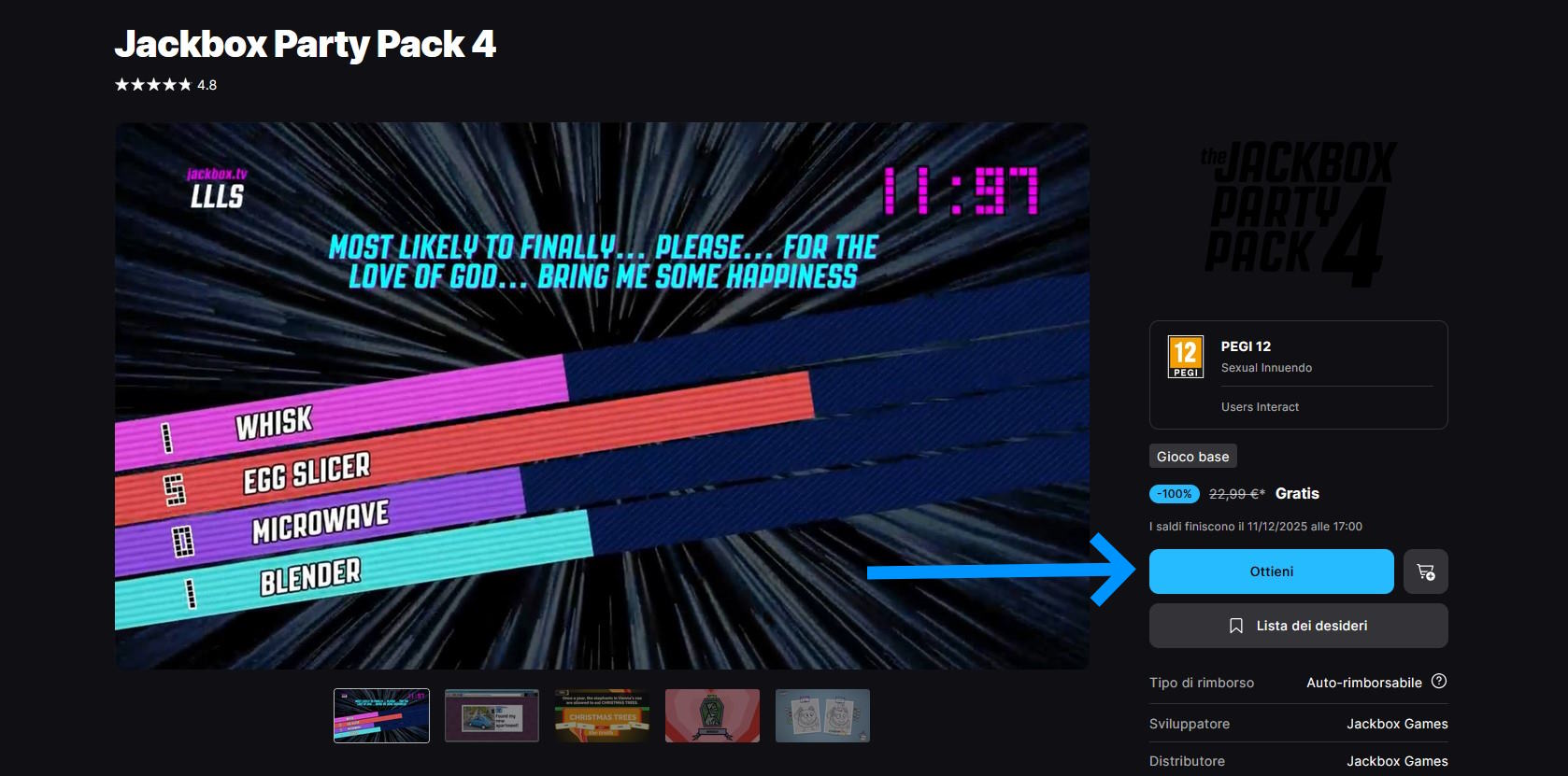 Per ricevere Jackbox Party Pack 4 basta collegarsi all’ indirizzo web: store.epicgames.com/it/p/jackbox-party-pack-4.