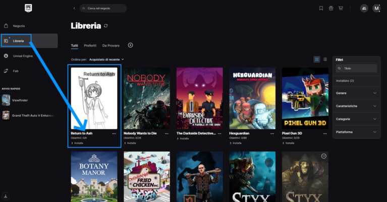 Troverete Return to Ash nella vostra libreria di Epic, per installarlo sarà sufficiente cliccare sulla sua immagine: