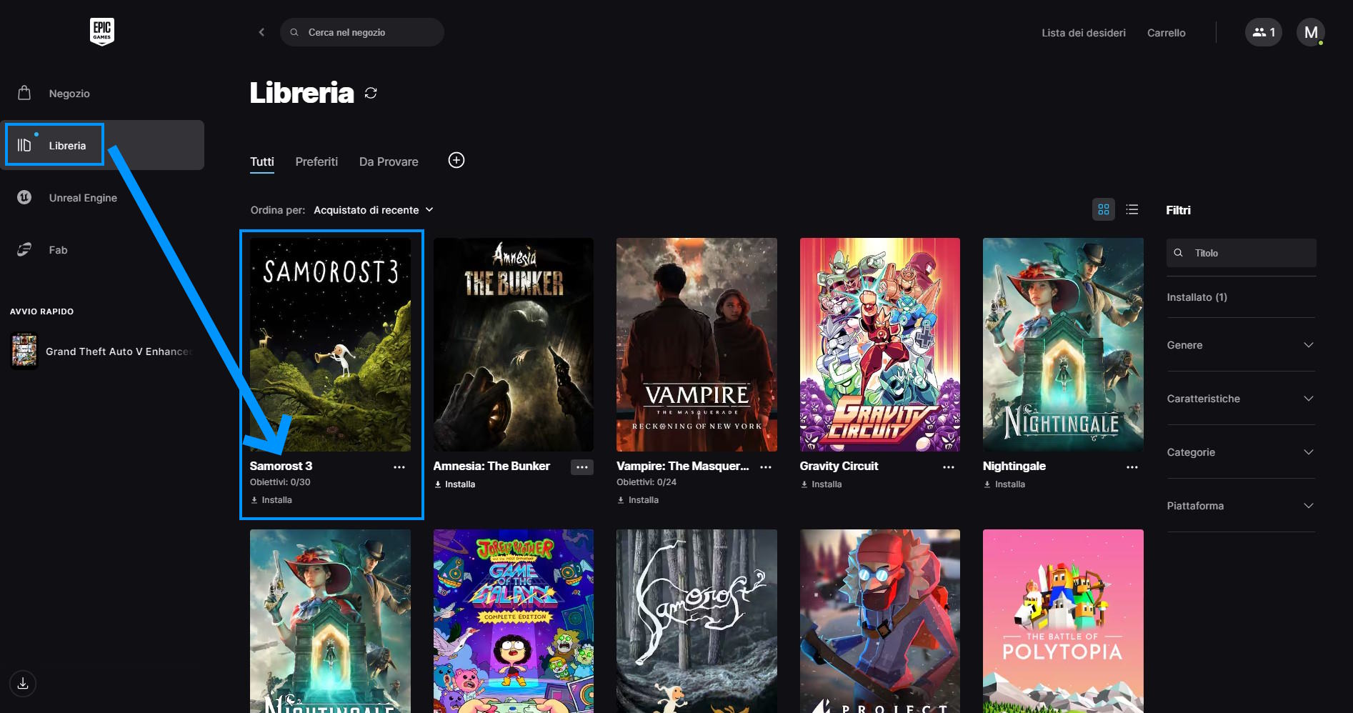 Troverete Samorost 3 nella vostra libreria di Epic, per installarlo sarà sufficiente cliccare sulla sua immagine: