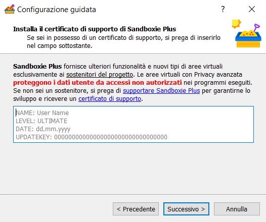 Nella prossima scherma ci verrà chiesto di inserire un certificato sostenitore, se abbiamo supportato il programma si potrà inserire ora, in caso negativo basterà semplicemente proseguire cliccando su “Successivo”: