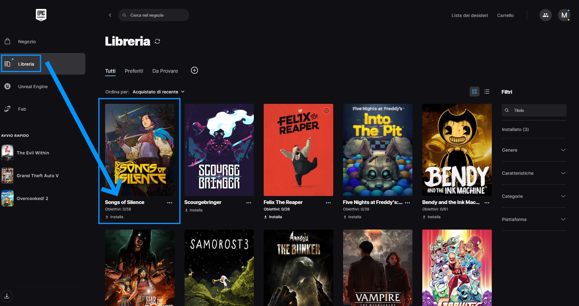 Troverete Songs of Silence nella vostra libreria di Epic, per installarlo sarà sufficiente cliccare sulla sua immagine: