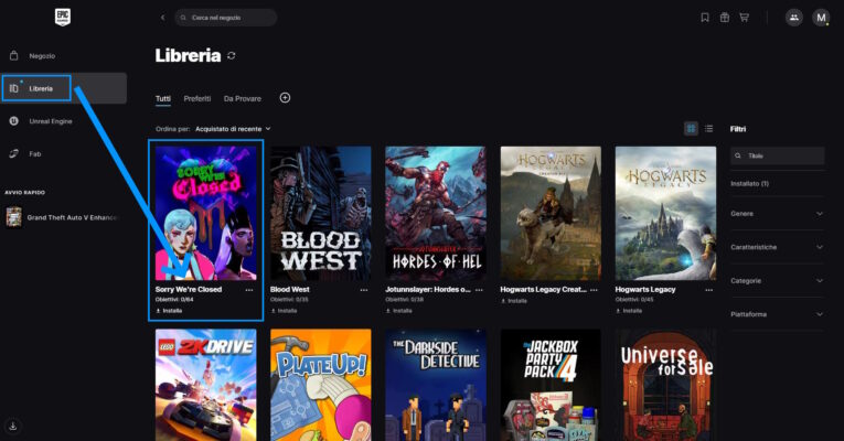 Troverete Sorry We’re Closed nella vostra libreria di Epic, per installarlo sarà sufficiente cliccare sulla sua immagine:
