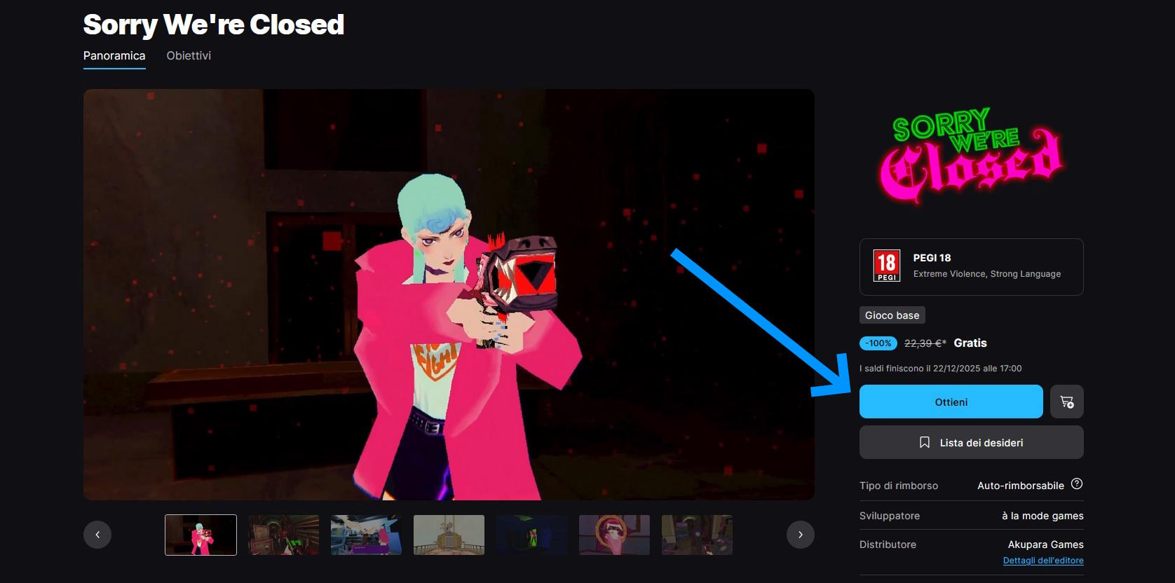 Per ricevere Sorry We’re Closed basta collegarsi all’ indirizzo web: store.epicgames.com/it/p/sorry-were-closed-724c86.