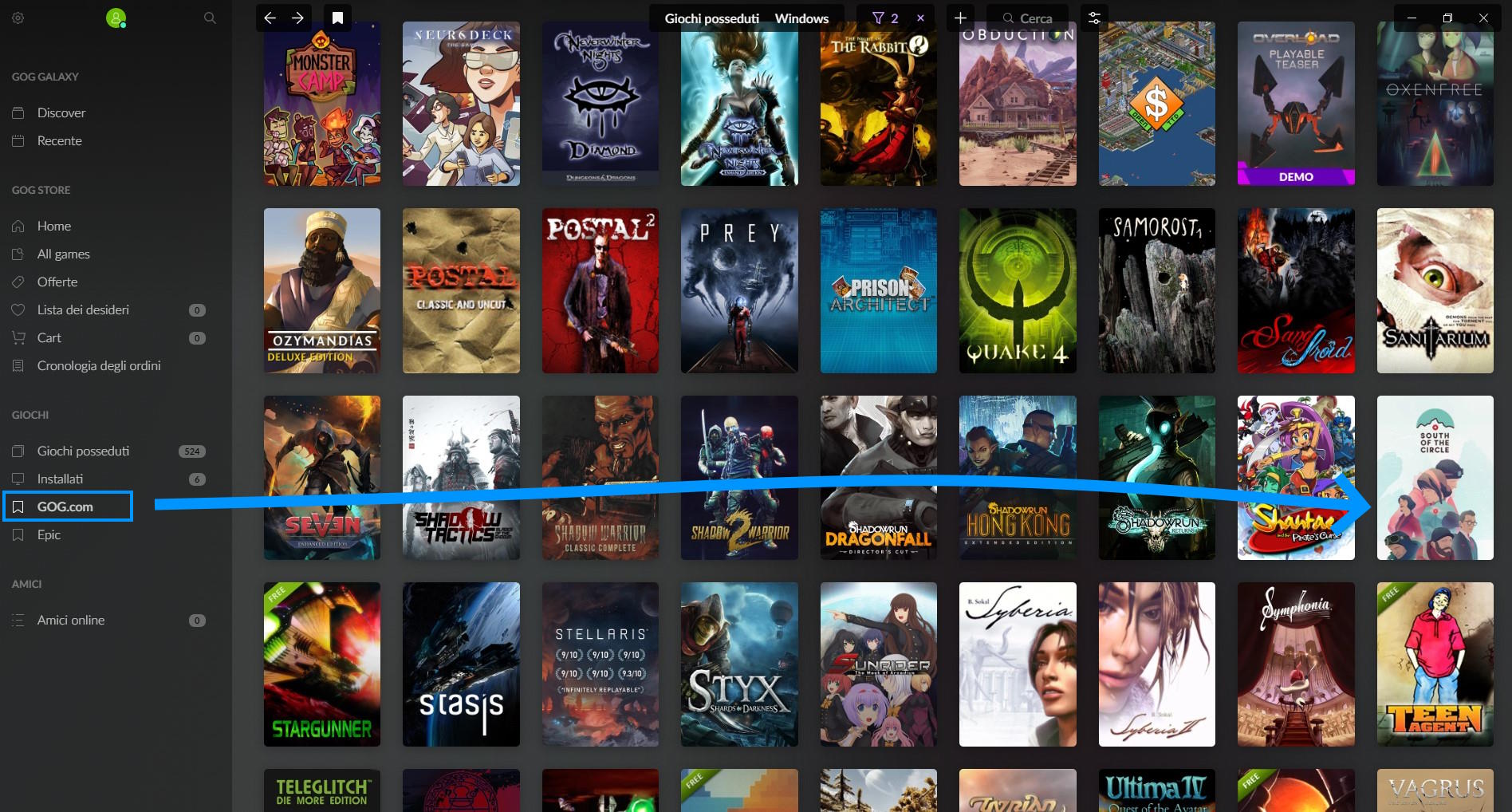 Dopo averlo scaricato ed installato basterà inserire i dati dell’account GOG, si dovrà poi cliccare su “Giochi posseduti” (o Owned Games se non avete settato la lingua Italiana) per visualizzare la libreria dei giochi posseduti: