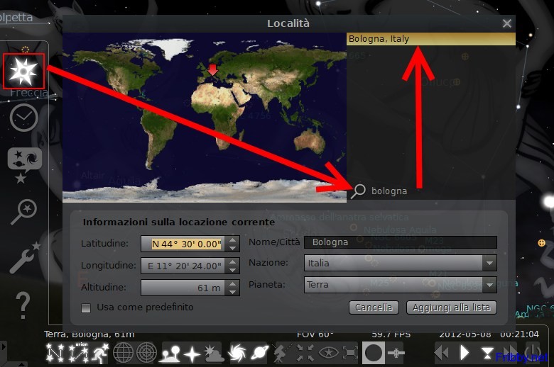 Una volta avviato stellarium consigliamo di selezionare la città più vicina a voi, in questo modo le stelle saranno automaticamente settate esattamente come è possibile vederle dalla vostra posizione, per fare questo basta cliccare sulla prima icona nel menu di sinistra, e nella nuova scheda selezionare la città più vicina presente nell’elenco. In alternativa è possibile settare autonomamente le coordinate della vostra posizione se le conoscete: