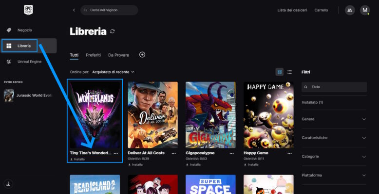 Troverete Tiny Tina’s Wonderlands nella vostra libreria di Epic, per installarlo sarà sufficiente cliccare sulla sua immagine: