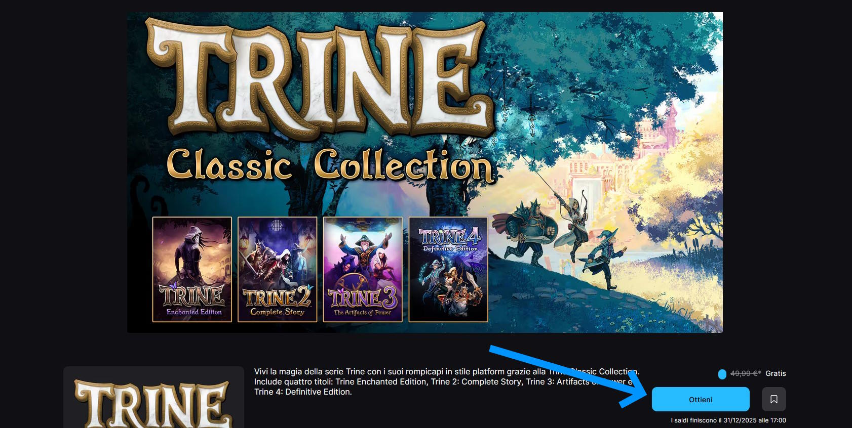 Fino a domani 31 dicembre Epic Games Store regala Trine Classic Collection.