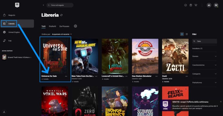 Troverete Universe for Sale nella vostra libreria di Epic, per installarlo sarà sufficiente cliccare sulla sua immagine: