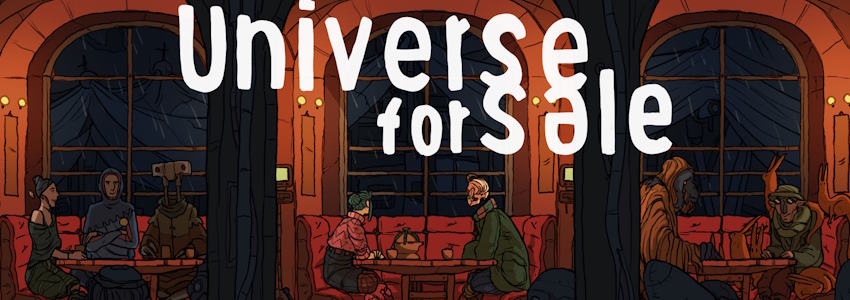 Universe for Sale è un gioco d’avventura disegnato a mano ambientato tra le dense nubi di Giove, dove oranghi sapienti lavorano come portuali e misteriosi cultisti strappano la carne dalle loro ossa per raggiungere l’illuminazione.
